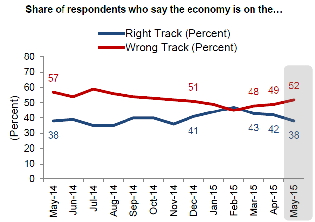 While attitudes aboutrnpersonal finances were up in the survey the optimism did not carry through tornthe economy as a whole. Those who thinkrnthe economy is on the right track dropped 4 percentage points to 38 while thernwrong track numbers rose 3 points to 52.</p