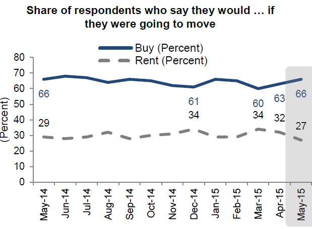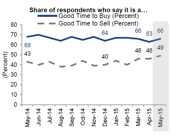The outlook for housing market growth appearsrnto be improving. Among those surveyed, the share who believe now is a good timernto sell a home continued its steady climb, reaching an all-time survey high ofrn49 percent in May-six percentage points higher than at the same time last year.rnThose who think it is a good time to buy reversed the 3 point decline of thernprevious month, returning to 66 percent – the same percentage who said theyrnwould prefer to buy rather than rent a home on their next move, also a 3 pointrngain. However those who think it wouldrnbe easy to get a home mortgage decreased by 2 percentage points to 50 percent,rnwhile those who think it would be difficult remained at 46 percent.</p