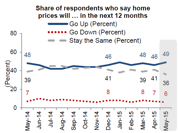 The share of respondents who expectrnhouse prices to increase over the next 12 months rose to 49 percent from 46rnpercent while expectations for the magnitude of any increase were unchanged atrn2.8 percent. The share of respondents who say mortgage rates will go up in thernnext 12 months fell to 47 percent, a 5 point decline.</p