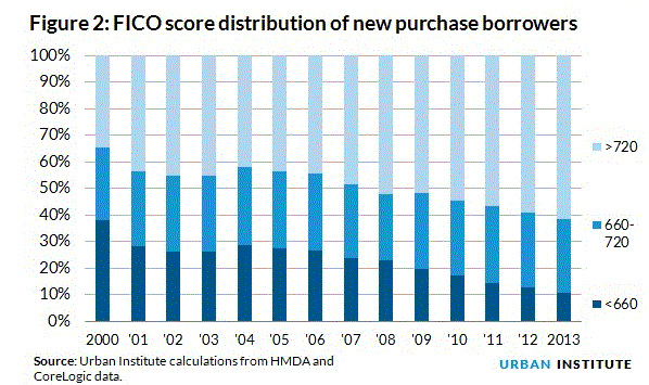 Put in other terms, high-creditrnborrowers make up the preponderance of those getting new purchase loans whilernthose with low-credit have only a tiny share compared to 2001.  Those in the two lower credit scorerncategories made up 40 percent of borrowers in 2013 where they had held justrnunder a 60 percent share in 2001.  Further,rnthose borrowers with credit scores below 660 had only a 10 percent presence in 2013rnoriginations where they made up slight less than 30 percent of borrowers fromrn2001 through 2006.</p