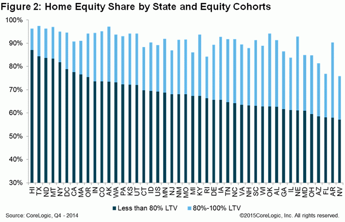 The highestrnpercentage of negative equity continues to be in Nevada at 24.2 percent of allrnmortgaged properties followed by Floridarn(23.2 percent); Arizona (18.7 percent); Illinois (16.2 percent) and RhodernIsland (15.8 percent). These top five states combined account for 31.7 percentrnof negative equity in the United States. rnTexas had the highest share of homes with equity at 97.2 percent closelyrnfollowed by Montana at 97.0 percent.  Otherrnstates with high levels were Alaska (97.2 percent), Hawaii (96.3 percent) and North Dakotarn(96.2 percent).</p