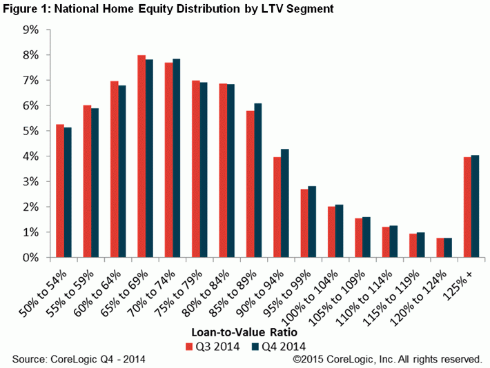 Frank Nothaft, CoreLogic’s ChiefrnEconomist said, “The share of home owners that had negative equity</bincreased slightly in the fourth quarter of 2014, reflecting the typicalrnweakness in home values during the final quarter of the year.  Our CoreLogic HPI dipped 0.7 percent fromrnSeptember to December, and the percent of owners 'underwater' increased to 10.8rnpercent. However, from December-to-December, the CoreLogic index was up 4.8 percent,rnand the negative equity share fell by 2.6 percentage points."</p