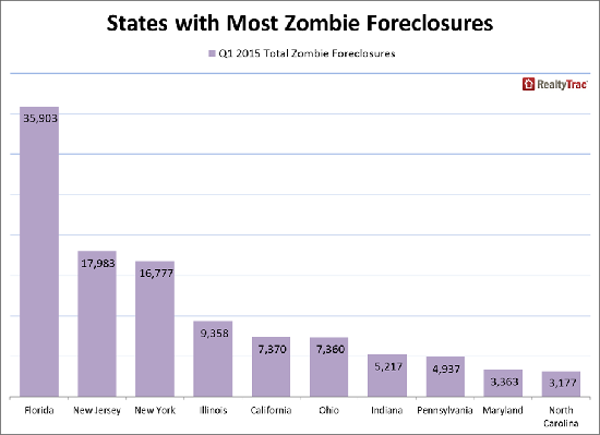However, despite decreasing 35 percentrnsince the first quarter of 2013, Florida still topped the list of states in itsrnnumber of zombies, 35,903, down from 54,908 a year earlier. This was twice the number of second place NewrnJersey and 26 percent of all foreclosures in the state.</p