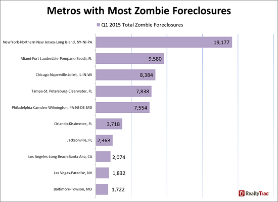 Among metro areas the greatest numberrnwere in the greater New York area with 19,177, 17 percent of properties in thernforeclosure inventory and a 73 percent increase from a year earlier. The number of zombies decreased from a yearrnago in the next three cities on the list, Miami, Chicago, and Tampa. Miami was down 34 percent, Chicago 35rnpercent, and Tampa 25 percent, but the three metros still posted the second,rnthird and fourth highest number of zombie foreclosures among metro areasrnnationwide: Philadelphia, in fifth place, had a 53 percent increase in zombiesrnfrom a year earlier and they now represent 27 percent of all foreclosures inrnthat city.</p