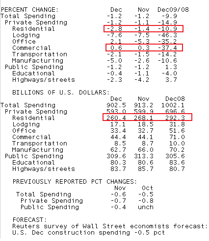 The December figure is 9.9 percent below the December 2008 estimate of $1,002.1 billion. The value of construction in 2009 was $939.1 billion, 12.4 percent below the $1,072.1 billion spent in 2008.