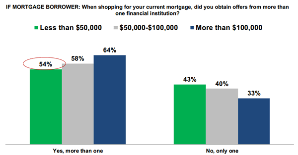 Further, the study showed that higher income consumers were more likely torndo more research and approach the search for a mortgage more efficiently. For example, lower income survey respondentsrnwere more likely than those with a higher income to have obtained a quote fromrnonly one lender and to make less use of technology in their mortgage duerndiligence. </p