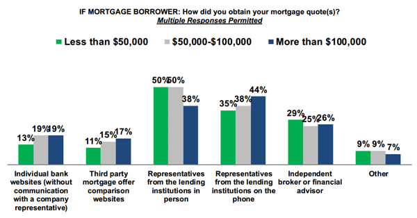 Survey results show that consumers do not always thoroughly evaluate theirrnmortgage options before obtaining a mortgage. rnLower income respondents are more likely to be influenced by mortgagernbrokers and real estate agents. More than 3 out of 4 higher income respondentsrnsaid that competitive offers would have a major influence on their choice,rnwhich is more than 20 percentage points higher than lower income respondents.rnReputation is important to all income groups: more than 2 out of 3 said itrnwould be a major factor in lender choice. </p