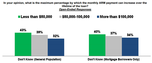The study also found that a substantial portion of all consumers do notrnunderstand key mortgage elements. rnRespondents were asked to estimate the maximum percentage by which thernmonthly adjustable-rate mortgage (ARM) payment can increase over the life ofrnthe loan. Forty-one percent said they didn’t know but among those who did offerrna guess the average was about 10 percent where the answer was actually 50rnpercent or more.7 Current mortgage borrowers’ average estimates wererneven further off of reality. </p
