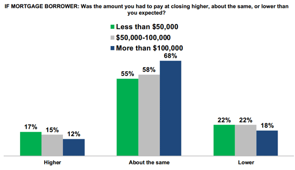 When asked about their own mortgage, higher income consumers were morernlikely to say they paid what they expected at their mortgage closing.</p