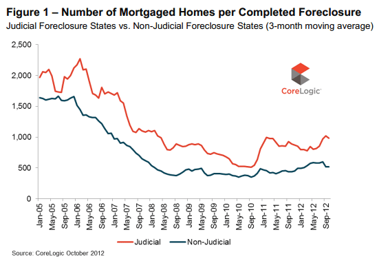 There was a dramatic drop in the raternof completed foreclosures in October according to CoreLogic’s National ForeclosurernReport issued on Monday; however this good news should probably be approachedrnwith caution.  The total of 58,000 foreclosuresrncompleted during the month was down 25 percent from the 77,000 completed inrnSeptember.  September’s number howeverrnwas originally reported at 57,000 and revised upward in the current ForeclosurernReport release.  The October total isrnalso 17 percent lower than in October 2011 when there were 70,000 completedrnforeclosures. .  </p