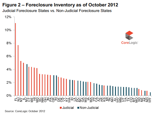 Five states, California, Florida, Michigan, Texas, andrnGeorgia accounted for 49 percent of all completed foreclosures in therncountry.  The highest foreclosurerninventories were in Florida (11.1 percent), NewrnJersey (7.7 percent), New York (5.3 percent), Illinois (5.0 percent) and Nevadarn(4.8 percent).  All of the high inventoryrnstates except Nevada use a judicial foreclosure process.