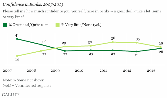 Americans’ confidence in U.S. banks hasrnrebounded a bit from the low it hit in 2012. Gallop reports that 26rnpercent of recent survey respondents said they have a “great deal”rnor “quite a lot” of confidence in banks compared to 21 percentrnsuch responses last year. This is the highest level for thesernresponses since June 2008 when confidence peaked at 41 percentrnbefore beginning to erode, ultimately by 20 percentage points.</p