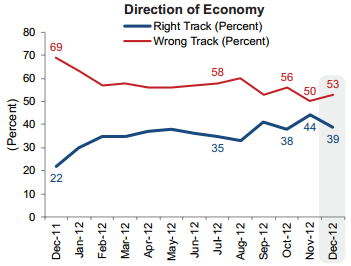 Fannie Mae’s Chief Economist pointed tornthe turmoil over the fiscal cliff and debt ceiling for a sharp drop in consumerrnconfidence in December. Fannie Mae’srnNational Housing Survey recorded a 5 point month-over-month decline in thernpercentage of respondents who think the nation’s economy is “on the right track”rnto 44 percent while “wrong track” responses rose from 50 to 53 percent.</p
