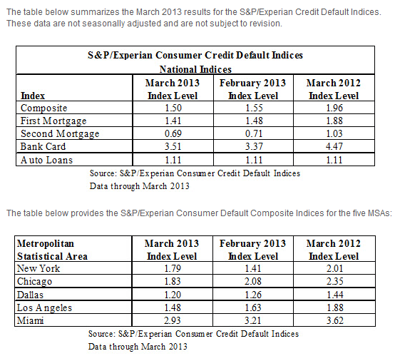 “The first quarter of 2013 shows healthy consumer credit quality,” saysrnDavid M. Blitzer, Managing Director and Chairman of the Index Committee forrnS&P Dow Jones Indices. “The first and second mortgage default ratesrndecreased, the bank card rate increased and the auto loan rate remained flat inrnMarch. All loan types remain below their respective levels a year ago.”</p