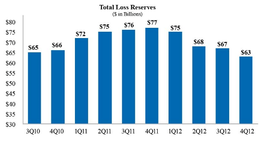 The company’s totalrnloss reserves decreased to $62.6 billion as of December 31, 2012 from $76.9 billion as of December 31, 2011. The company expects the trends of improvingrnhome prices and declining single-family serious delinquency ratesrnwill continue. As a result,rnthe company believesrnthat its totalrnloss reserves peaked as ofrnDecember 31, 2011. Accordingly, the company does not expect totalrnloss reserves to increasernabove $76.9 billionrnin the foreseeable future.</p