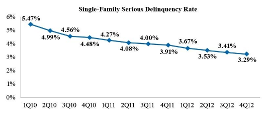 The company’s single-family foreclosure rate was 0.99 percentrnfor the full year of 2012.  It acquired 41,112rnsingle-family REO properties, primarily through foreclosure, in the fourth quarter of 2012 comparedrnwith 41,884 in the third quarter of 2012. As of December 31, 2012, the company’srninventory of single-family REOrnproperties was 105,666, compared with 107,225 as of September 30, 2012. The carrying value of therncompany’s single-family REO was $9.5 billion as ofrnDecember 31, 2012.</p