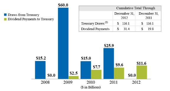 The company paidrna total of $11.6 billion in dividends to the Department of the Treasury underrnthe senior preferred stock purchase agreement between the two entities and didrnnot request a draw from Treasury for the fourth quarter.  To date Fannie Mae has received a total ofrn$116.1 billion in draws from the Treasury while paying $31.4 billion inrndividends. Under terms of the stock purchase agreement dividends cannot be usedrnto offset draws so Treasury still maintains a 117.0 billion liquidationrnpreference in Fannie Mae.  The companyrndid not request any draws from Treasury in 2012.  </p