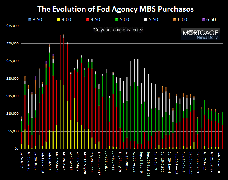 In the week ending February 17, 2010, the Federal Reserve purchased a total of $11.3 billion agency MBS. In those four trading days the Federal Reserve sold $300 million (supported the roll market) for a net total of $11.0 billion MBS purchases.