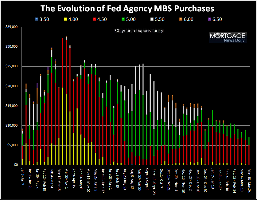 In the week ending March 24, 2010, the Federal Reserve purchased a gross total of $8.26 billion agency MBS. In that week the Fed sold $260 million mortgage-backed's (supported the roll), for a net total of $8.0 billion agency MBS purchases. This amount is $2.0 billion less than the previous three reporting periods.