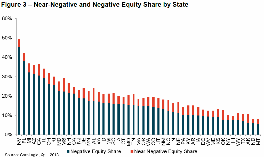 CoreLogicrnsaid that higher end properties were more likely to have positivernequity than the low end. Forrnexample, 88 percent of homes valued at greater than $200,000 havernequity compared with 73 percent of homes valued at less thanrn$200,000.</p<p"The impressivernhome price gains of 2012 and the beginning of 2013 have had a bigrnimpact on the distribution of residential home equity,” said Dr.rnMark Fleming, chief economist for CoreLogic. “During the past year,rn1.7 million borrowers have regained positive equity. We expect thernpent-up supply that falling negative equity releases will moderaternprice gains in many of the fast-appreciating markets this spring.”</p<pThe highestrnpercentage of negative equity properties were in Nevada at 45.4rnpercent. Florida was second at 38.1 percent followed by Michigan (32rnpercent), Arizona (31.3 percent) and Georgia (30.5 percent.) Theserntop five states combined account for 32.8 percent of negative equityrnin the U.S.</p