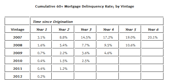 It is no surprise that the mortgagesrnoriginated during the last years of the housing boom have caused most of thernproblems with delinquency and foreclosure. rnTransUnion says that, as of this past February mortgages originated beforern2009 make up 50 percent of all outstanding mortgages but 86% of all mortgagerndelinquencies. Twenty percent of thernloans originated in 2007 have been delinquent at one time or another, 14.5rnpercent of them within their first three years. Loans originated in every year since thenrnshows a declining rate of delinquency at every “age” compared to the 2007rnvintage. For example, loans originatedrnin 2010 had experienced only about one-sixth the delinquencies by their thirdrnyear as the 2007 vintage. </p