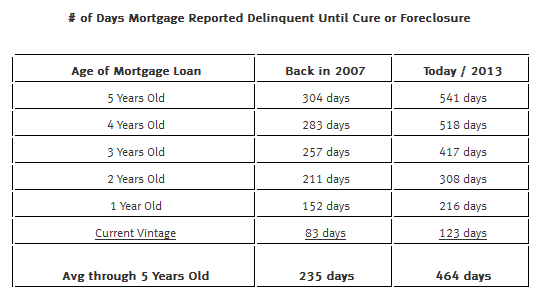 The company also found that thernnumber of days a mortgage was reported as delinquent to a credit bureau beforernit either cured or was foreclosed has increased dramatically. TransUnion provided this “snapshot” ofrndelinquent loans as they would have appeared in 2007 and earlier this year. </p
