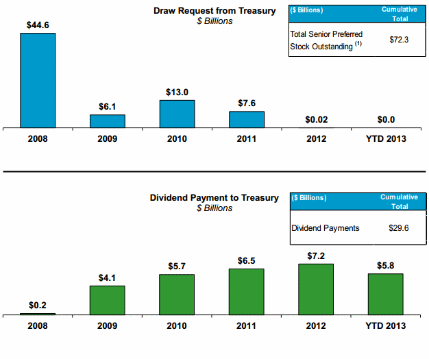 Under the purchase agreement, the payment of dividends cannot be used tornoffset prior Treasury draws. Accordingly,rnwhilernFreddie Mac has paid aggregaterncashrndividends to Treasury of $29.6rnbillion through Marchrn31, 2013 Treasury still maintains a liquidation preference of $72.3 billion on the company’srnsenior preferred stockrnas of March 31, 2013.</p