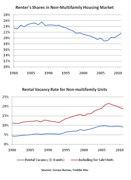 Renters generally make up morernthan 20 percent of single family occupants but this number dropped below 20rnpercent when homeownership was peaking. rnNow renters are becoming a bigger share of the residential housing marketrnand the share of renters in residential homes is approaching levels that wererntypical in the 1980s and 1990s.</p