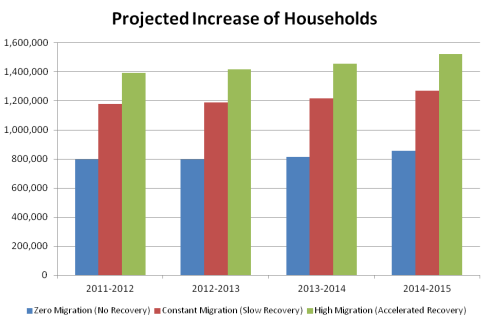 Internationalrnmigration is a key to overall population growth and this is influenced byrneconomic growth. The Census Bureaurnpredicts that immigration over the period of 2011 to 2015 could increasernpopulation by 5.6 million to 13.3 million. rnThernvariation in population growth across different age groups also hasrnimplications for rental housing. When agernspecific household data and population growth estimates are combined to thernstudy expects there will be approximately 1.2 million new households createdrnannually over the subject period assuming constant migration. In the accelerated growth scenario there willrnbe increased immigration and faster household formation on the part of youngrnadults, increasing the demand for rental units. rnNone of the scenarios account for any pent-up demand which couldrnincrease the demand for rental housing substantially.</p