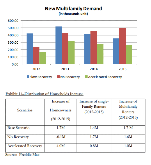 Freddie Mac’s economists lookedrnat both the renters and owner’s share of the residential housing market basingrnits predictions on three different economic scenarios; 1) no economic recovery,rn2) A base scenario with economic growth slightly slower than long run averages;rn3) An accelerated Recovery. </p