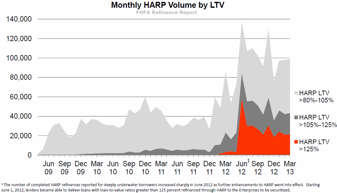 Of therntotal 2.46 million HARP transactions, roughly half, or 1.37 million haverntaken place under the revised HARP guidelines put in place at the endrnof 2011. Those guidelines eliminated the prior 125 percent loan-to-value (LTV) cap on HARP mortgages and during the firstrnquarter of 2013 22 percent of loans refinanced through the programrnhad an LTV greater than 125. During the quarter 45 percent of thernHARP loans had LTV ratios greater than 105 percent. </p