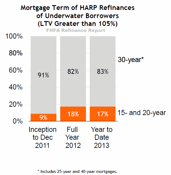 Anotherrnrevision to the HARP guidelines provided incentives to borrowers tornreduce the term of their new loans from that of their old, typicallyrn30 year, mortgages. Thus far in 2013 17 percent of HARP borrowersrnhave opted for 15- or 20-year loans.</p