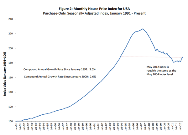 On a non-seasonally adjusted basis thernHPI was up over 1.5 percent in May.  FHFArnalso revised its previously reported 0.8 percent increase in April down to arn0.7 percent increase.   The Index is nowrn17.0 percent below the peak it hit in April 2007 and is roughly the same as itsrnlevel in May 2004.  </p