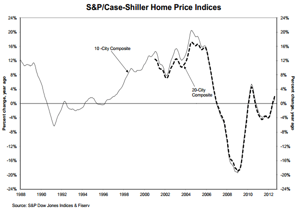 The above chart shows the index levels for the 10-City and 20-City Composite Indices. As ofrnAugust 2012, average home prices across the United States are back to their summer/autumn 2003 levels for bothrncomposites. Measured from their June/July 2006 peaks, the decline for bothrnisrnapproximately 30% through August 2012 and approximately 35% from the June/July 2006rnpeak values. The August 2012 levels for both Composites are about 8.5% above their recent early 2012 lows.</p