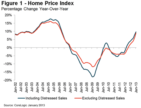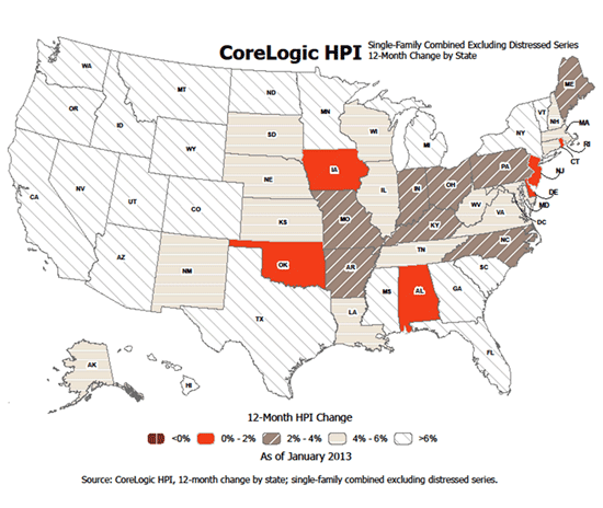Home prices as measured by the CoreLogic Home Price Index (HPI)rnhad the largest annual increase in January that it had experienced since Aprilrn2006. The January number was up 9.7rnpercent from January 2012 and represented the 11th consecutive month the HPI,rnwhich includes distressed sales, increased from its level one year earlier. Thernindex was up 0.7 percent from December. rnAll but two states, Delaware and Illinois are experiencingrnyear-over-year price gains. </p