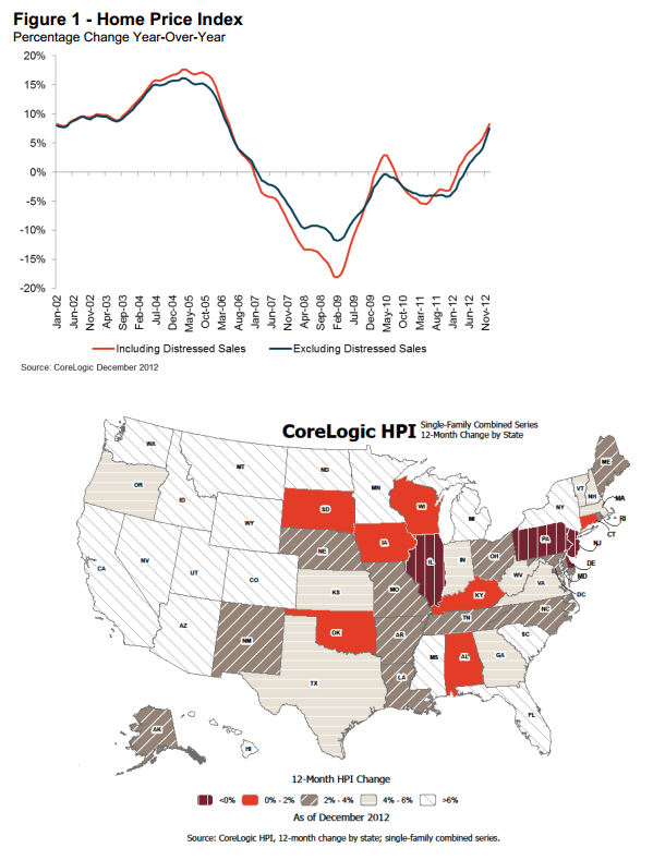 The index that included distressed sales (sales of owned realrnestate and short sales) increased by 8.3 percent compared to December 2011, thernlargest increase since May 2006. Withrndistressed sales excluded the HPI increased 7.5 percent year over year. Prices were up 0.4 percent includingrndistressed sales and 0.9 percent excluding distressed sales compared tornNovember. </p