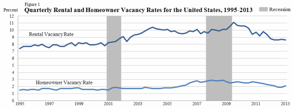 The U.S. vacancy rate and the rate ofrnhomeownership both declined in the first quarter of 2013 with the homeownershiprnrate hitting the lowest level in 17 years. rnAccording to the Census Bureau the rate of homeownership in the countryrndeclined from 65.6 in the fourth quarter of 2012 to 65.2. The rate in the first quarter of 2012 wasrn65.5 percent. The first quarter 2013rnrate is the lowest rate since the fourth quarter of 1995 when it was 65.1. The vacancy rate was 8.6 percent, 0.2rnpercentage points lower than one year earlier and 0.1 percentage point lowerrnthan in the fourth quarter of 2012. </p