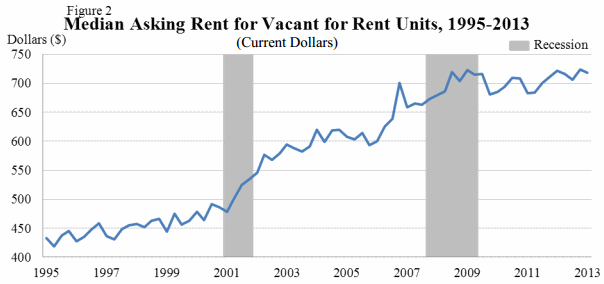 The median asking price for vacantrnrental units in the first quarter was $718. rnThe median asking price for a vacant unit that was for sale wasrn$139,800.</p