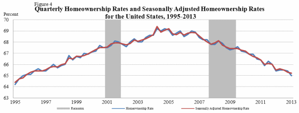 As always the oldest age cohort, thosernover 65 years, had the highest homeownership rate at 80 percent and those underrn35 years the lowest rate at 36.8 percent. rnNon-Hispanic whites, again as usual, had the highest rate ofrnhomeownership at 73.4 followed by all other races at 54.6 percent, Hispanic atrn45.3, and Black alone 43.1 percent. Notrnsurprisingly households with family income equal to or greater than the medianrnhad a rate of 80.0 percent while those with incomes below the median had arnhomeownership rate of 50.0 percent.