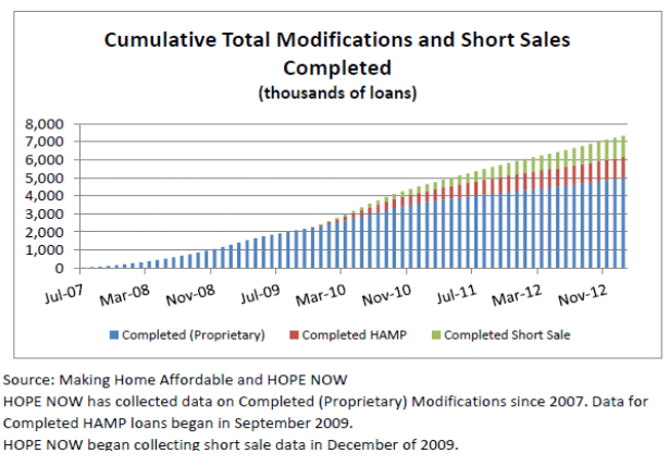 HOPE NOW reports that its membersrncompleted 78,397 permanent loan modifications during the month of January and 29,244 short sales. rnThe voluntary, private sector alliance of mortgage servicers, investors,rnmortgage insurers, and non-profit counselors have now assisted 6.18 millionrndistressed homeowners since 2007.</p