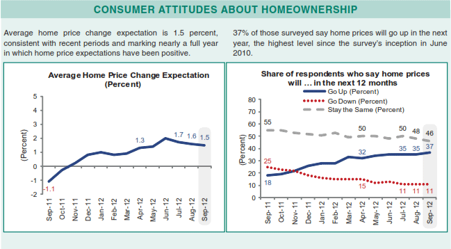 “Consumers are showing increasing faith in thernnascent housing recovery,” said Doug Duncan, senior vice president and chiefrneconomist of Fannie Mae. “Home price change expectations have remained positivernfor 11 straight months, and the share expecting home price declines hasrnstabilized at a survey low of only 11 percent. Furthermore, the Federal Reserve’srnlatest round of quantitative easing has caused a large drop in mortgage raternexpectations. Friday’s September jobs report, including the strong upwardrnrevisions for prior months, a sizable increase in earnings, and a sharp declinernin the unemployment rate, should provide further impetus for improving consumerrnconfidence in the housing market.”</p