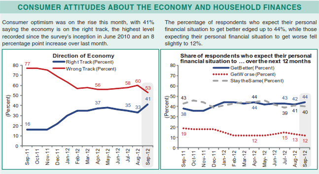Consumer confidence was way up; 41rnpercent now believe the economy is on the right track, up from 33 percent lastrnmonth. The percent who believe therndirection is wrong dropped from 60 percent to 53 percent. These are, respectively, the highest andrnlowest readings in the survey’s history.</p