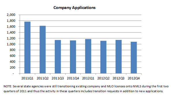 In the fourth quarter applications forrnlicensing/registration were submitted by 1,082 companies, 3,021 branches, andrn20,689 individuals. Applications werernapproved for 837 companies, 2,587 branches, and 16,653 individuals. Once state agencies finished transitioningrncompany and MLO licenses into the NMLS system in mid 2011 the quarterly levelrnof new company applications has remained relatively static at around 1,100 torn1,200. Individual MLO applications howeverrnhave increased fairly steadily from a low of about 14,000 in the third quarterrnof 2011 to the present level, although applications in Q4 were down slightlyrnfrom those in Q3.