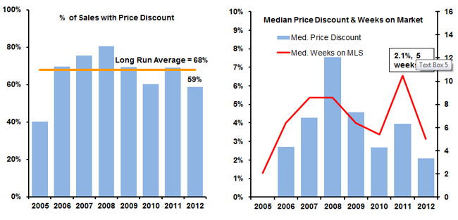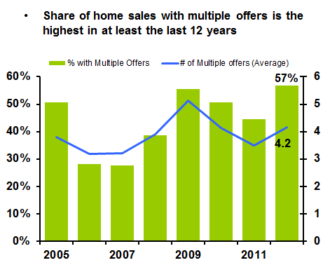 Fifty-seven percent of home salesrnfeatured multiple offers in 2012, the highest in at least the past 12rnyears. Each home that received arnmultiple officer received an average of 4.2 compared to 3.5 offers in 2011. Lower priced homes and distressed properties -rnbank-owned real estate (REO) and short sales – had more multiple offers thanrnmarket sales, seven out of ten compared to one-half.</p