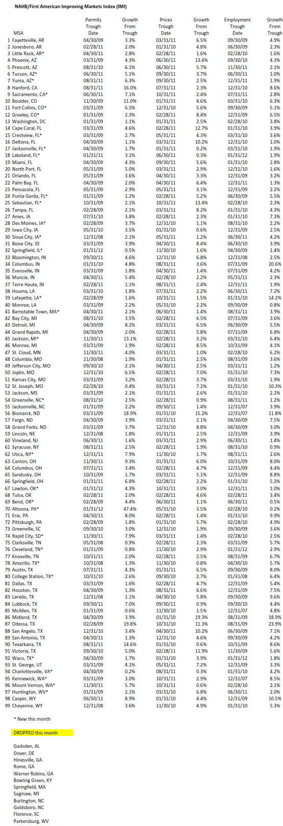Inclusion in the Improving Markets Index (IMI) is achievedrnwhen a market has improved above its respective trough in three categories; thernnumber of housing permits issued as measured by Census Bureau reports,rnemployment according to the Department of Labor, and home price appreciationrnbased on data from Freddie Mac.</p