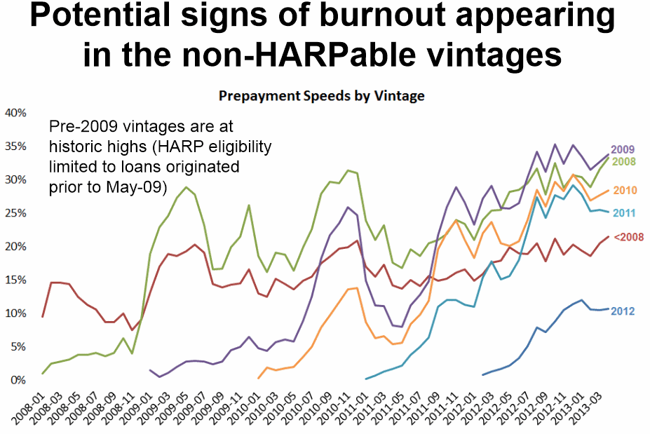 </p<pPostrn2009 loans are showing signs of potential burnout meaning borrowersrnhave already taken maximum advantage of the current rate environment.rn The remaining loans are not eligible for HARP which is limited tornpre-2009 loans, and would not have had time to build up sufficientrnequity cushions to protect them from 2009-2012 price declines. </p
