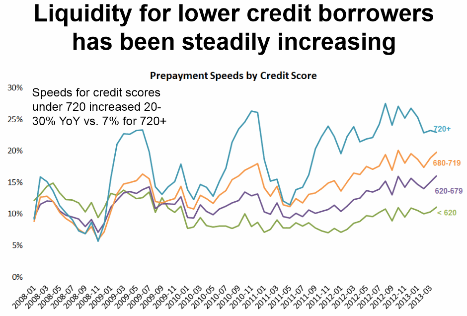 </prn<pPrepaymentrnspeeds for lower credit borrowers have also been increasing. Borrowers with credit scores under 720 paid their loans off at a raternthat increased by 20 to 30 percent on a year-over basis compared to 7rnpercent among borrowers with scores over 720.</p<p