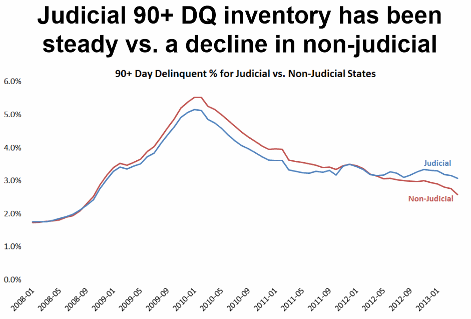 ThernMonitorrnalsornfound that the rate of foreclosure sales in judicial process statesrnhit the highest point since 2010 and their are signs that thernforeclosure inventories are beginning to decrease in those states. But the amount of time the property remains in the foreclosurerninventory continues to grow as does the disparity in timelinesrnbetween judicial and non-judicial states.</p