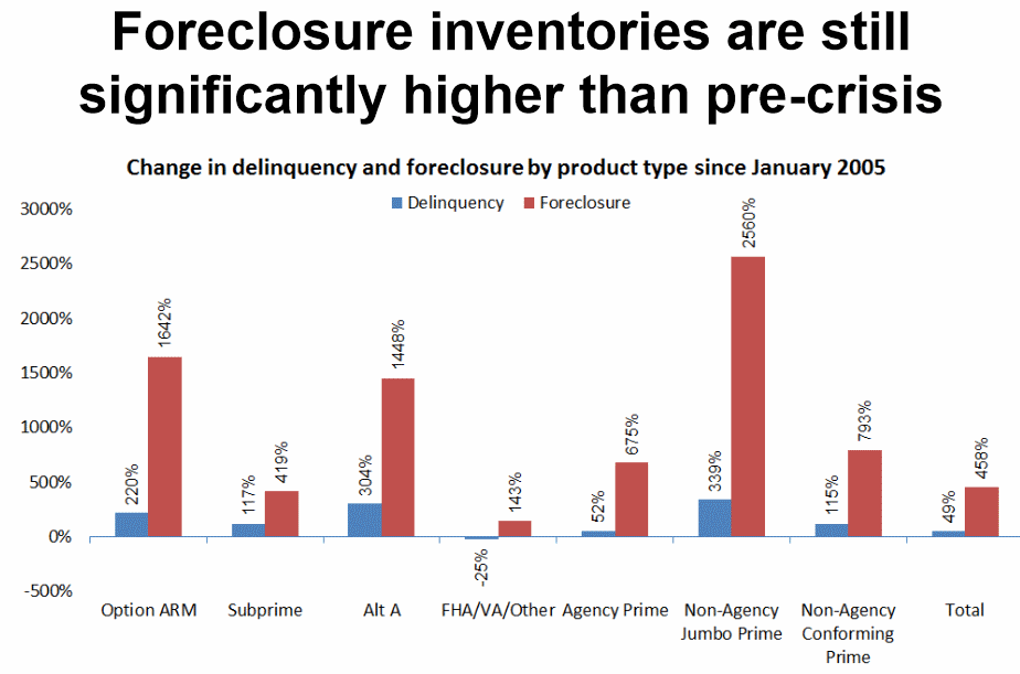 </prn<pHowever,rnwhile delinquencies are resolving, foreclosure inventories are stillrnsignificantly higher than pre-crisis across all products, in mostrncases stunningly so. </p
