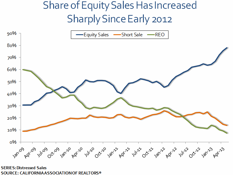 Thernshare of the market going to short sales remained relativelyrnunchanged, easing down from 14.8 percent in April to 14 percent inrnMay. The combined share of depressed property sales was downrnyear-over-year in 31 of the 36 California counties reporting. Equityrnsales increased to 78.2 percent in May from 75.6 percent n April. Equity sales had a 55.8 percent market share in May 2012.</p